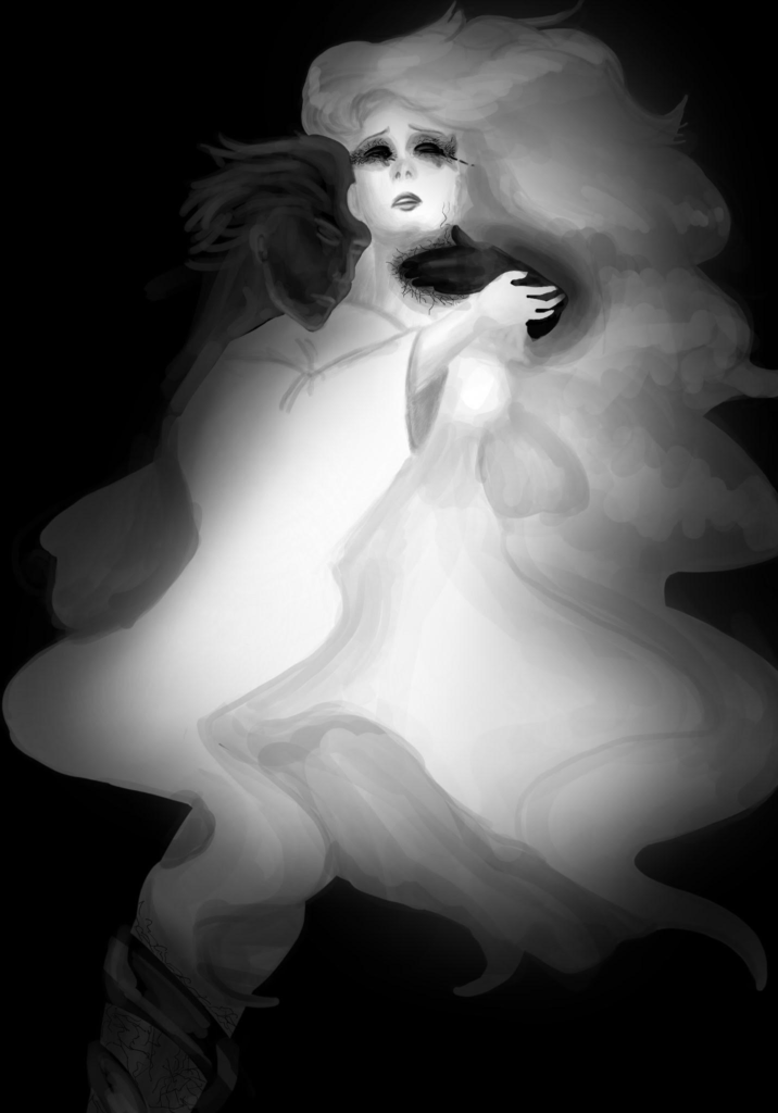 This piece was made in reminiscence of a toxic relationship I had in the past, months after the breakup. It served as a way to highlight the pain and anguish I felt during the time. I had done so much for a person who would give so little back, and even demanded more than I could give. It felt like I was losing a part of myself in the process as my own personal identity and morals were being compromised for the needs of a selfish individual. The woman’s waning illumination in this piece portrays part of my own “light” being actively dimmed. The woman clutching onto the destructive figure signifies my unwillingness to let that person go, despite how much they had hurt me. I mistook their attempt to “hold onto me” as mutual love and affection, not realizing the cold and dark reality of it being for controlling purposes. I was left vulnerable, isolated, and alone with only this dark force to keep me company, much like what the image exhibits. However, as over a year has passed since this harmful experience, the illustration is merely meant to signify a distant memory that is now nothing more than a ghost of my past.